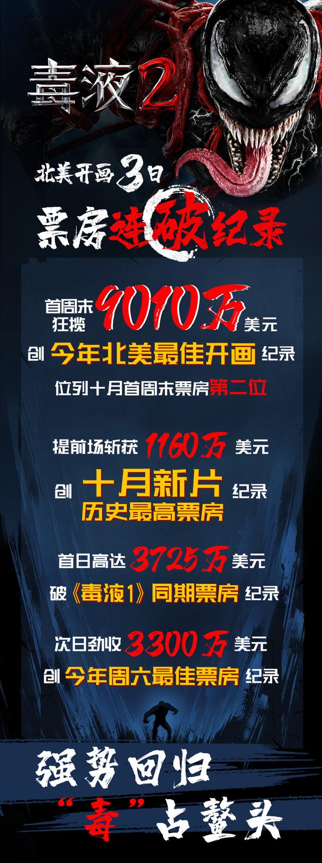 《毒液2》已登录北美,并创下多项的票房纪录,根据可靠消息,北美提前场已经斩获1160万美元的票房,创造了十月份新片历史最高票房纪录,不仅超过了前作《毒液:致命守护者》,同时也超过了今年上映的两部好莱坞大片《速度与激情9》和《尚气》的提前场票房,取得了后疫情时代的开门红。最新消息是,《毒液2》北美次日再收3300万美元创周六单日票房纪录;首周末三天票房狂揽9010万美元,票房势头迅猛,俨然是近年北美最火爆的超级英雄大片。