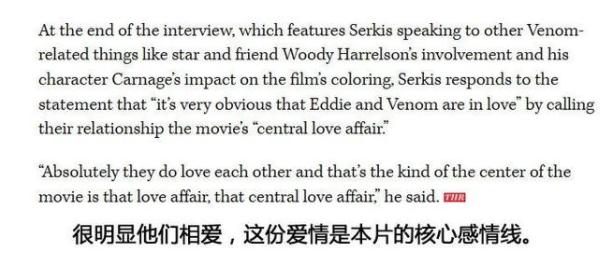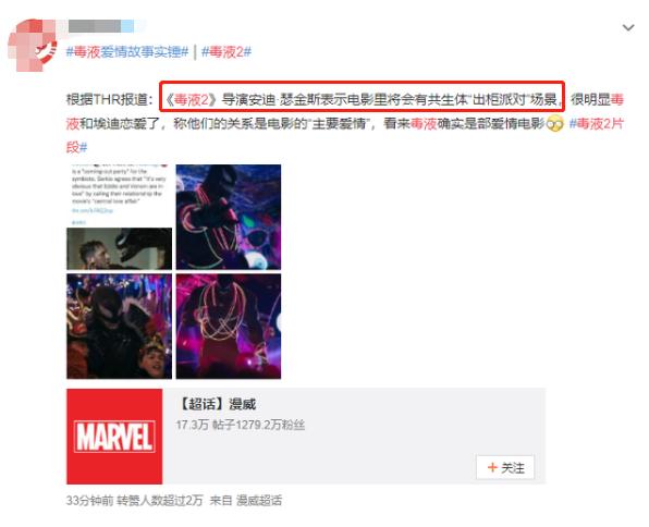 根据媒体采访透露,《毒液2》的导演曾公开表示,这部电影中会有“出柜派对”的场景,这也意味着毒液和男主会有爱情的关系,而且导演也明确表示这份爱情会是这部电影的核心感情线。