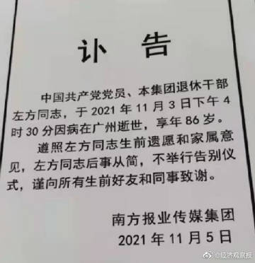 北京时间2021年11月4日,据南方报业传媒集团发布的讣告:中国共产党党员,该集团退休干部左方同志,于2021年11月3日下午4时30分因病在广州逝世,享年86岁。