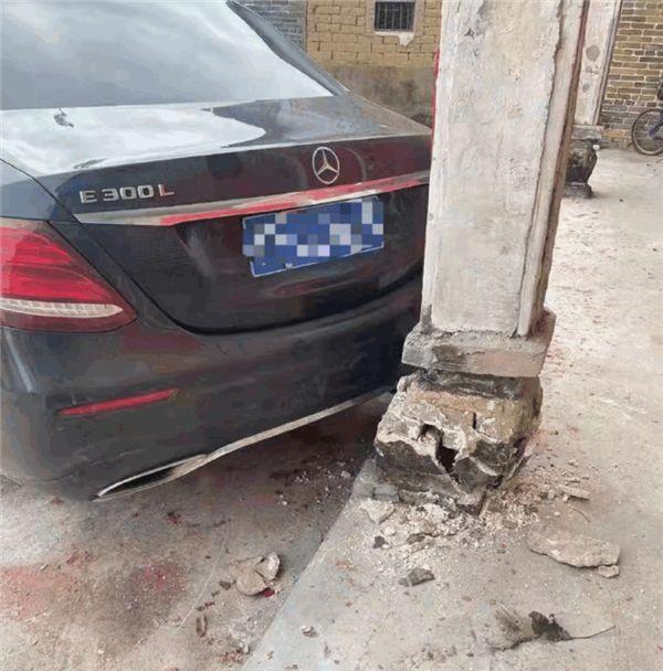 从曝光的现场来看,一辆奔驰E级轿车在倒车时,将祠堂的一个立柱撞坏,与地面的连接处几乎断开,奔驰尾部也有损伤。