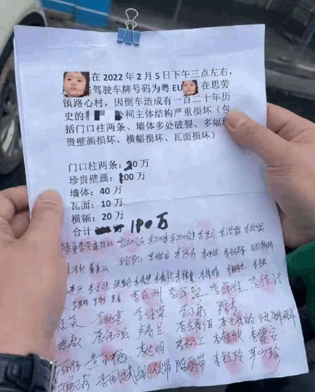 索赔内容显示,在2022年2月5日下午三时左右,车主驾驶车牌号粤E开头的车辆在思劳镇路心村,因倒车撞坏有120年历史的李姓祠堂的柱子以及损毁部分财产。