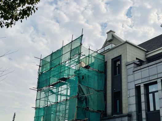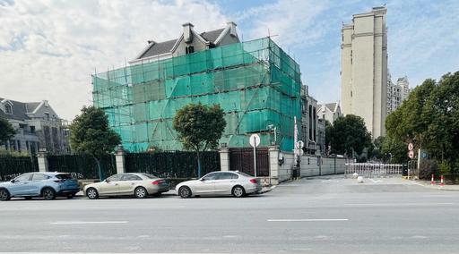 12月21日,起火别墅现场看到,由于发生火灾,别墅及其周围建筑已被封锁,搭起了脚手架,用施工网遮挡,从外部已无法看到过火情况。