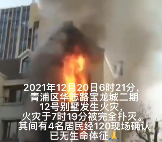 据中国消防通报,2021年12月20日6时21分,上海市青浦区宝龙城二期,一栋一别墅清晨突然发生火灾。接到群众报警后,迅速出动的消防救援人员,于当天7时19分将大火扑灭。