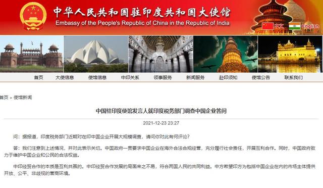 据中国驻印度大使馆网站12月23日消息,使馆发言人就印度税务部门调查中国企业答问。